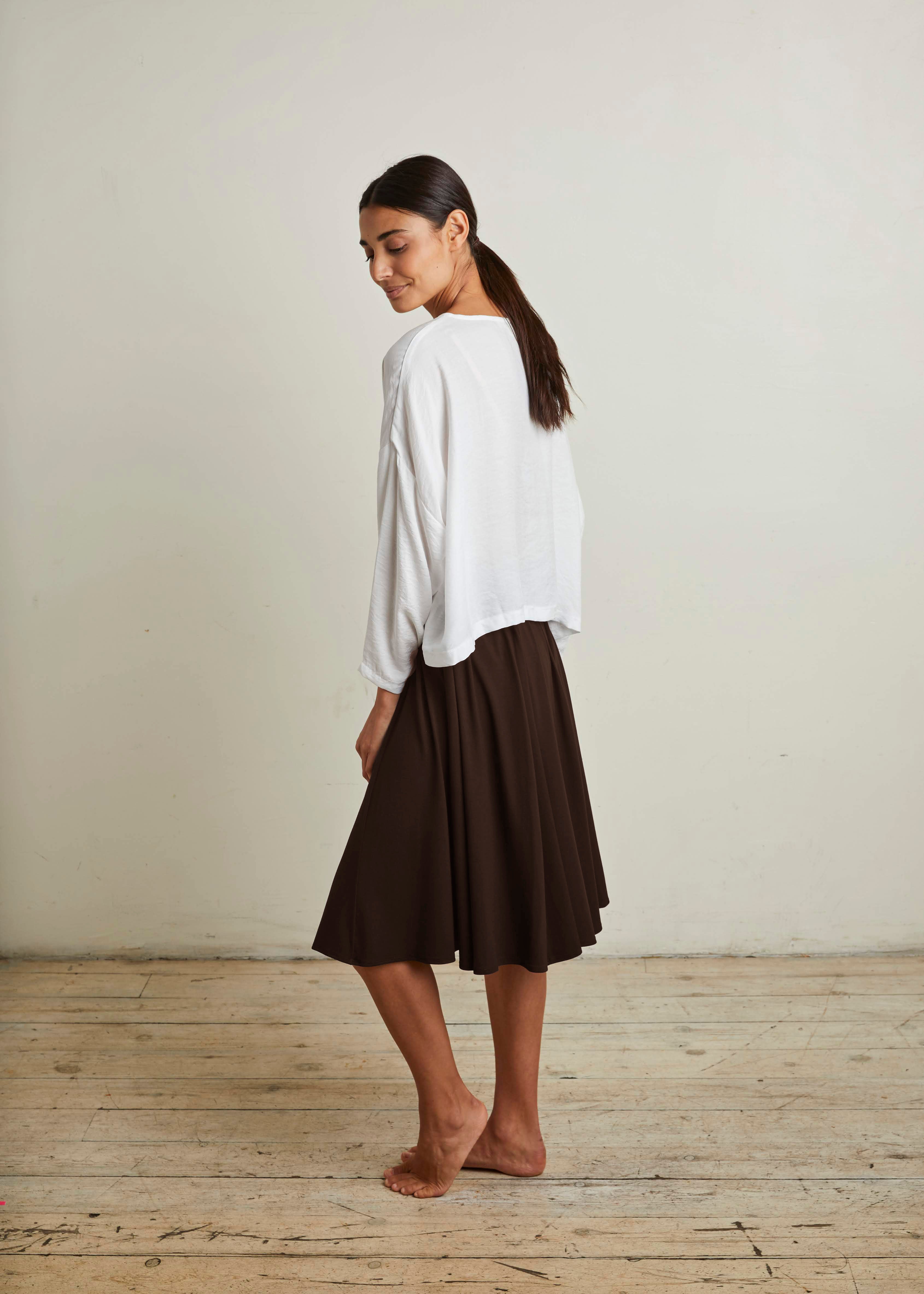 The jersey peek skirt is my first Mimu item! I've started living in this skirt. It is so comfortable and can easily be dressed up or down. I fold the waistband over twice to get the length I want and it's perfect!